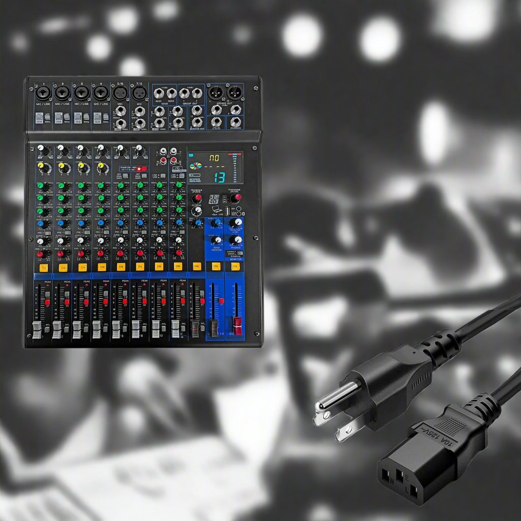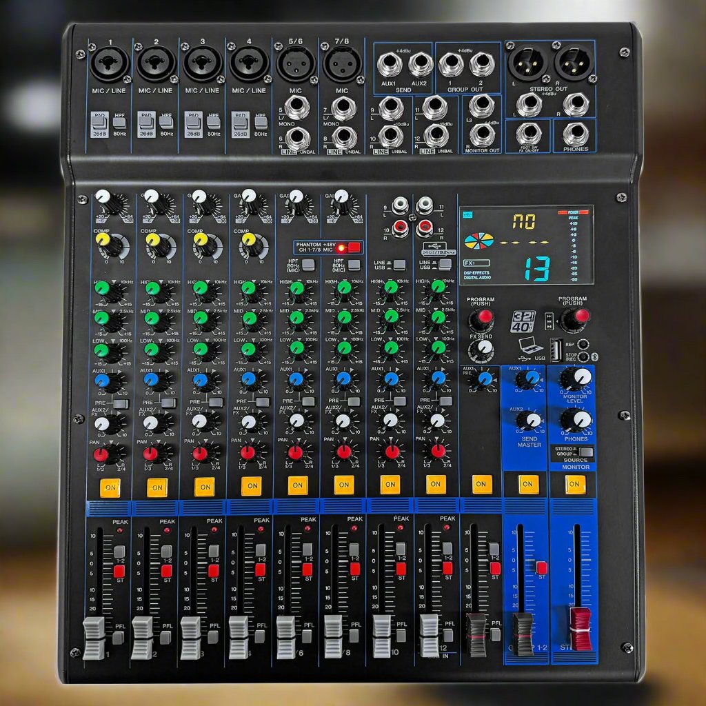 5 Core 12-channel mixer with 99 DSP effects, Bluetooth 5.1, USB connectivity, and 48V phantom power. Ideal for live performances and recordings.